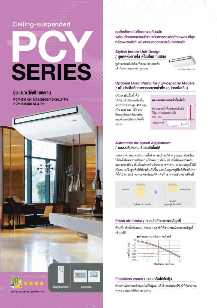 Mitsubishi PCY Series แอร์มิตซุบิชิอินเวอร์เตอร์แบบแขวนใต้ฝ้า รูปลักษณ์สวยทันสมัยมาพร้อมเทคโนโลยีใหม่ล่าสุดที่จะช่วยลดพลังงานได้อย่างมีประสิทธิภาพ ทำงานเสียงเงียบสนิท และส่งกระแสลมเย็นได้ทั่วทุกจุดภายในบริเวณห้อง